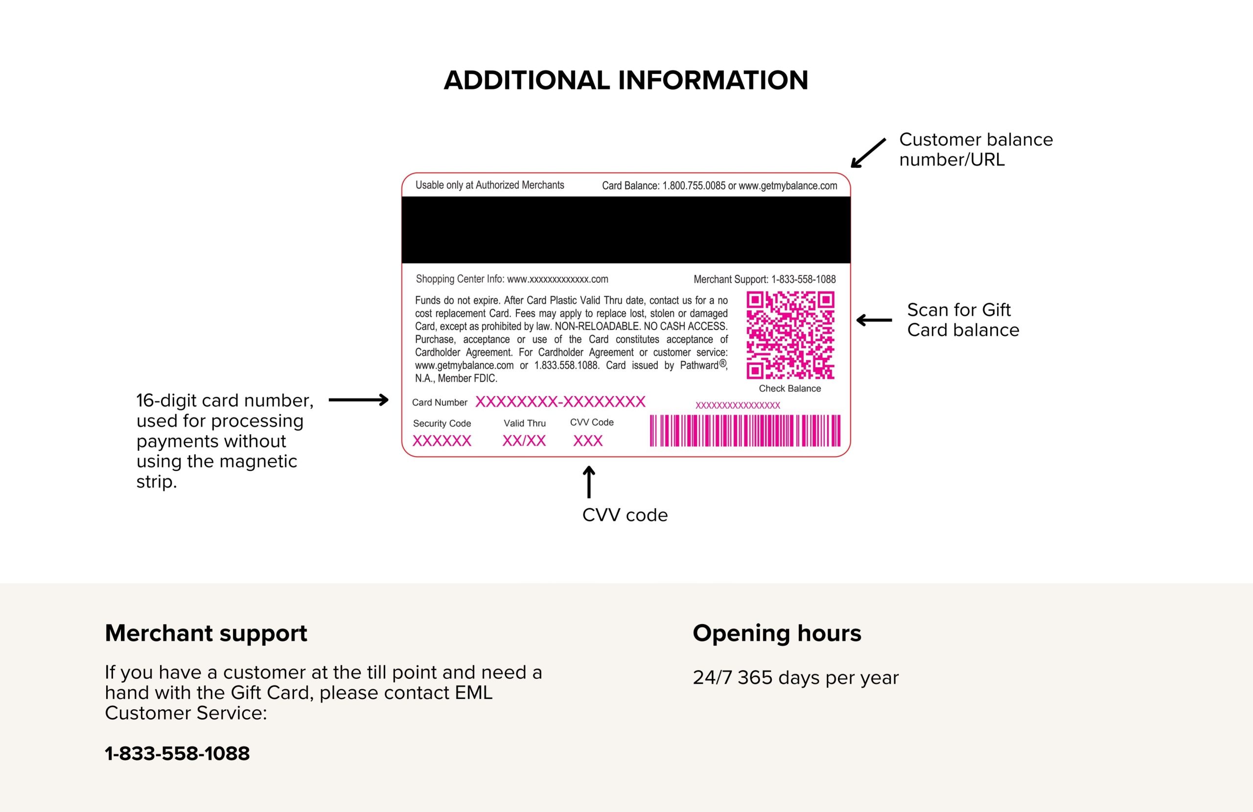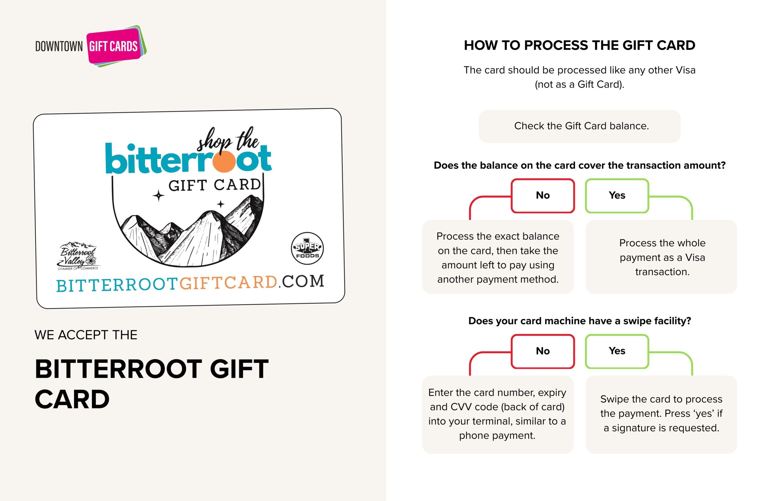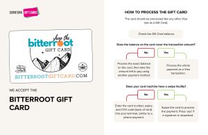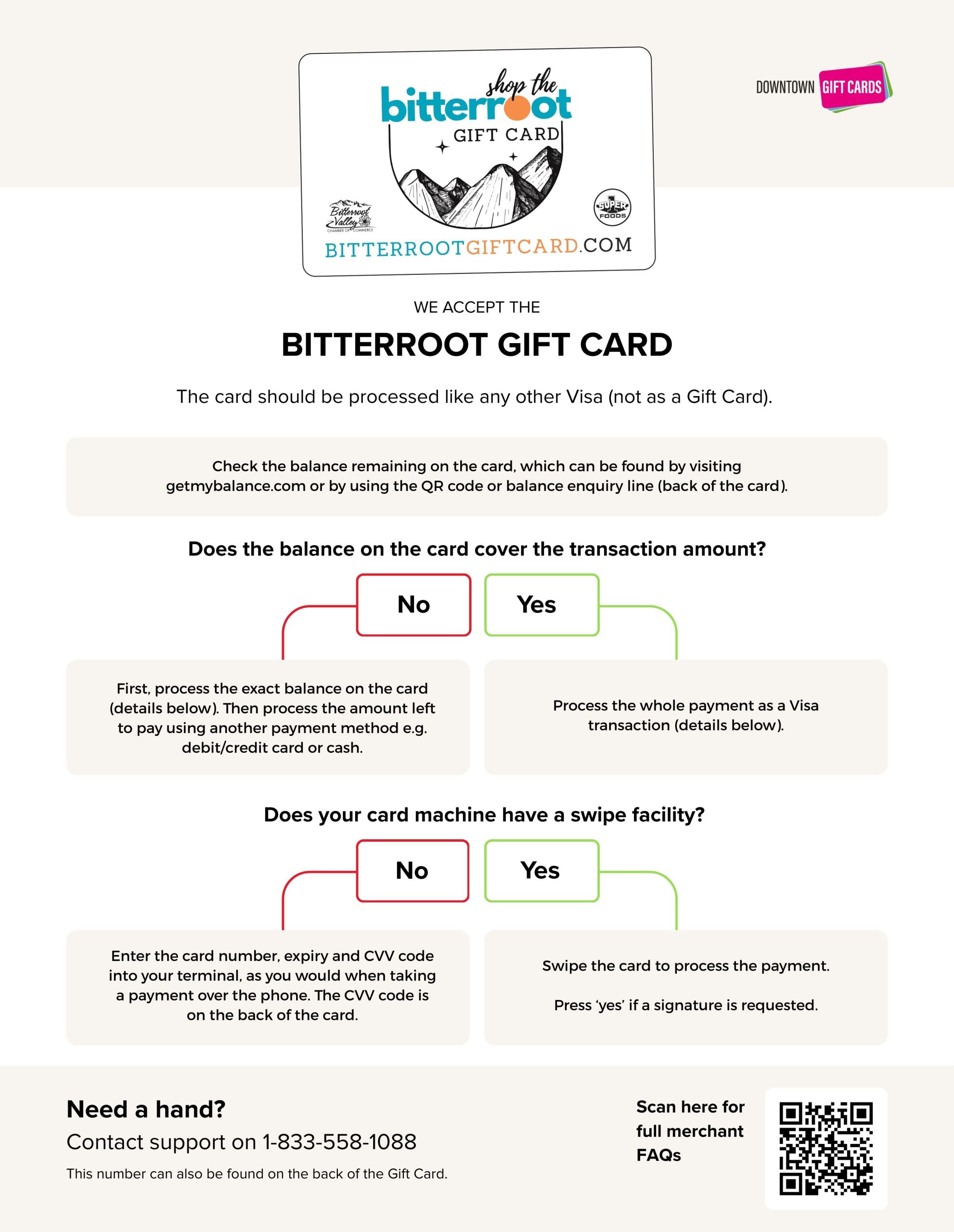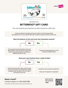 From reminding staff to process the card as a Visa to how to accept split payments, how to check the balance to the customer service number, place this cheat sheet at your till point and make accepting Downtown Gift Cards simple.